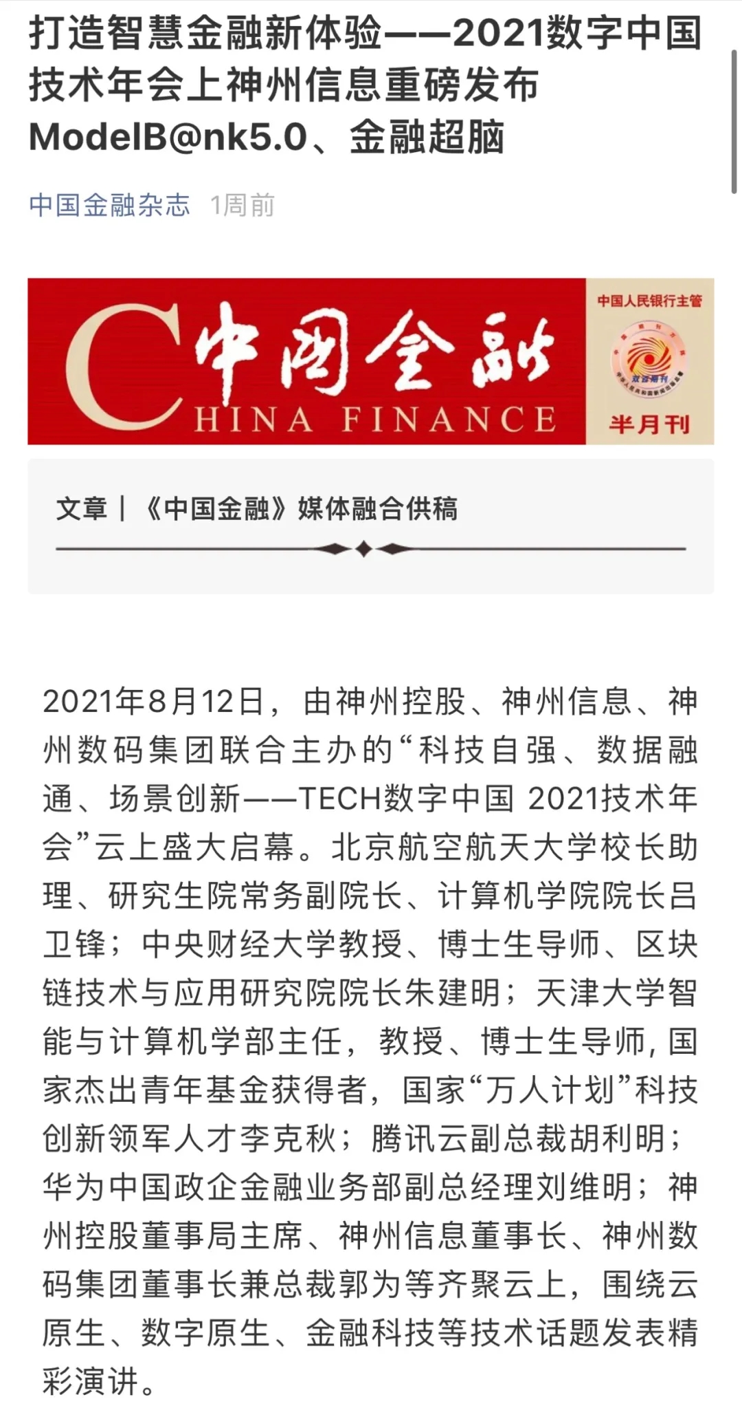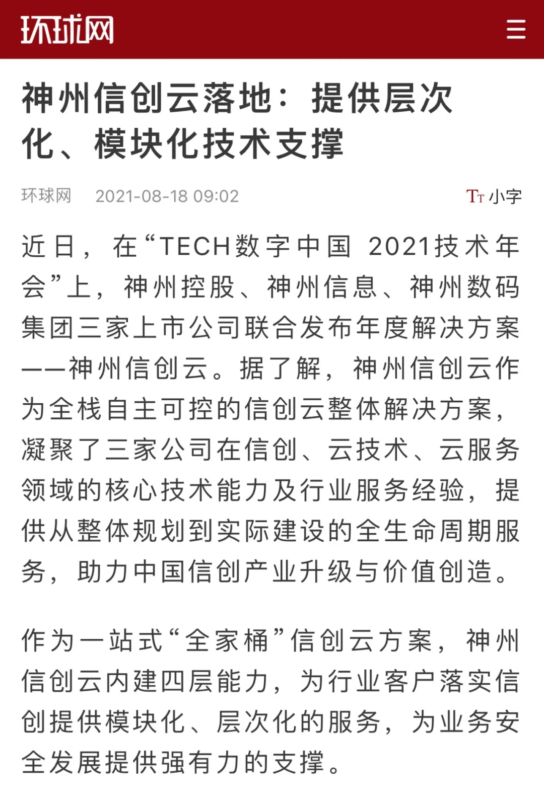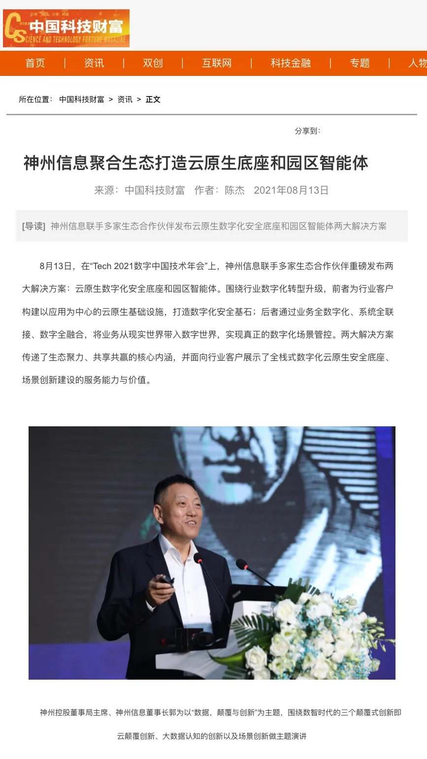 8月12日,由神州控股、神州信息、lewin乐玩集团联合主办的“科技自强、数据融通、场景创新——TECH数字中国 2021技术年会”云上盛大启幕,发布神州信创云、ModelB@nk5.0、金融超脑Sm@rtFSB、云原生数字化安全底座、园区智能体等重磅产品,国内各大权威、影响力媒体多角度多频次对盛况进行报道!