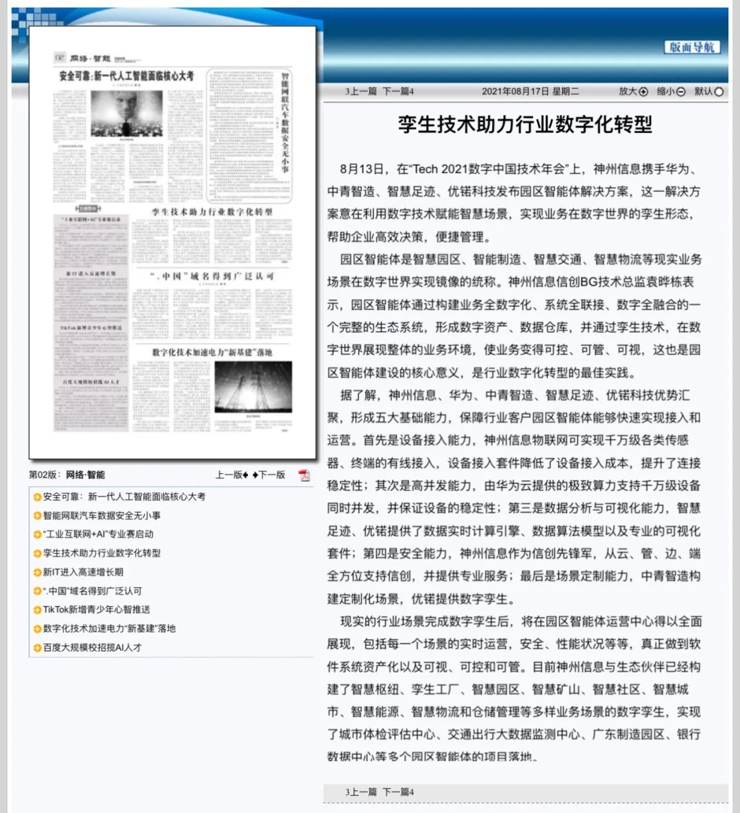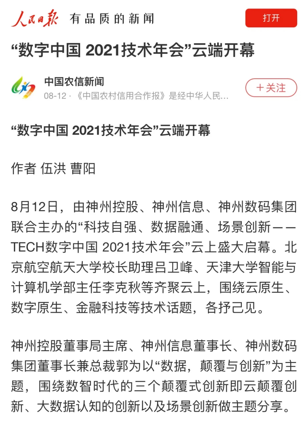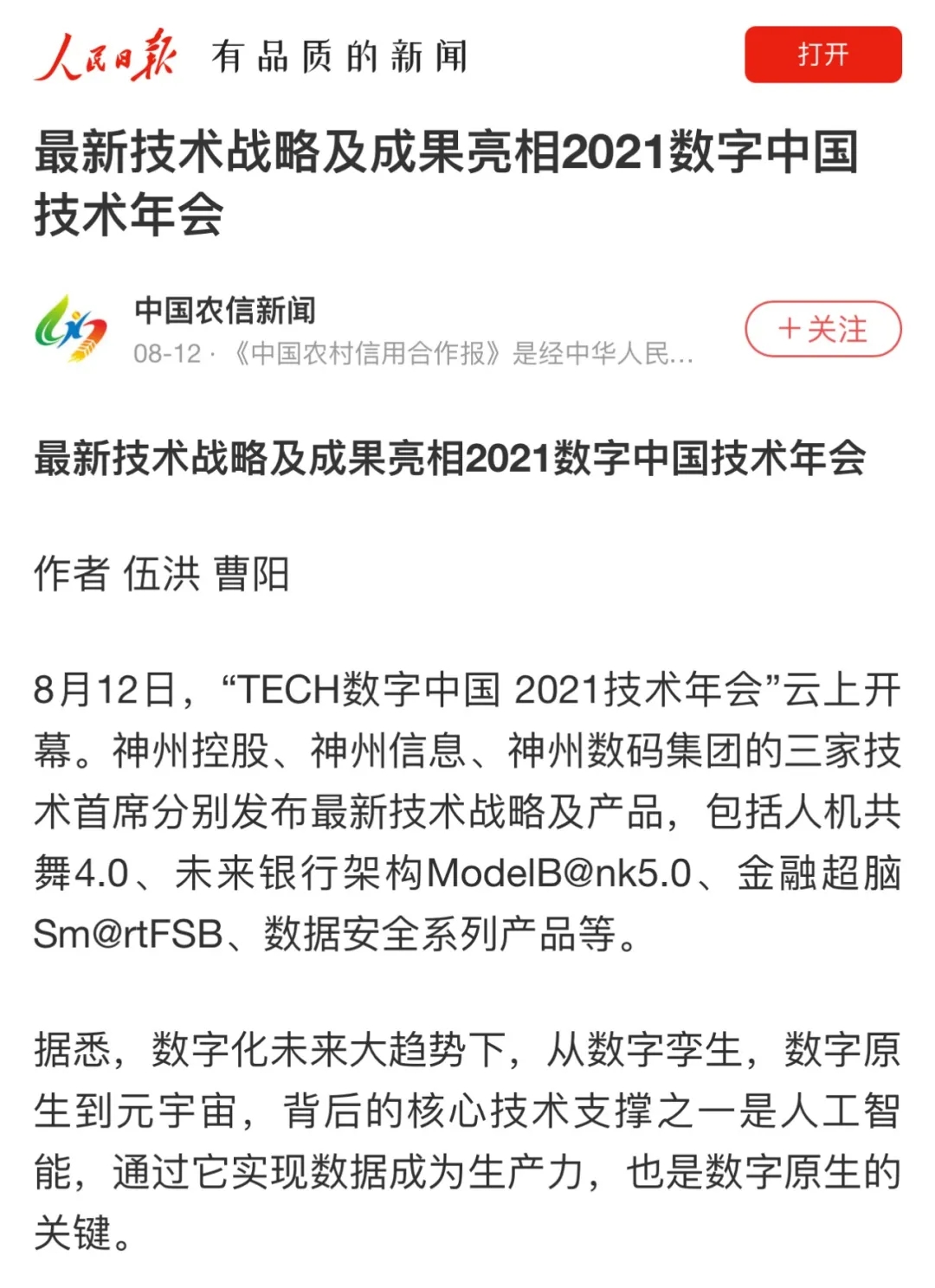 8月12日,由神州控股、神州信息、lewin乐玩集团联合主办的“科技自强、数据融通、场景创新——TECH数字中国 2021技术年会”云上盛大启幕,发布神州信创云、ModelB@nk5.0、金融超脑Sm@rtFSB、云原生数字化安全底座、园区智能体等重磅产品,国内各大权威、影响力媒体多角度多频次对盛况进行报道!